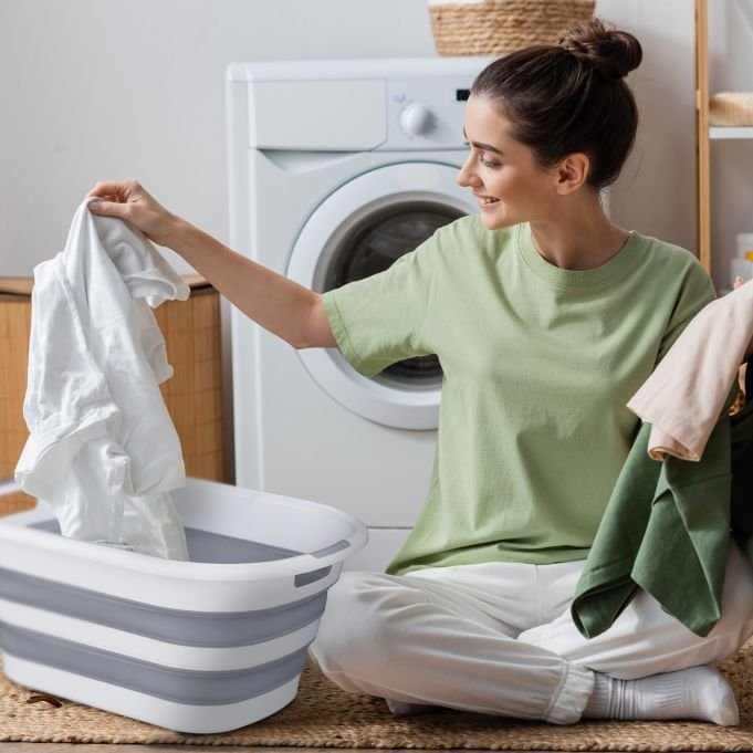 .حوض بلاستيكي واسع مزود بمقابض جانبية لسهولة النقل، وبتصميم ثنائي اللون، وقابل للطي لتوفير مساحة عند التخزين